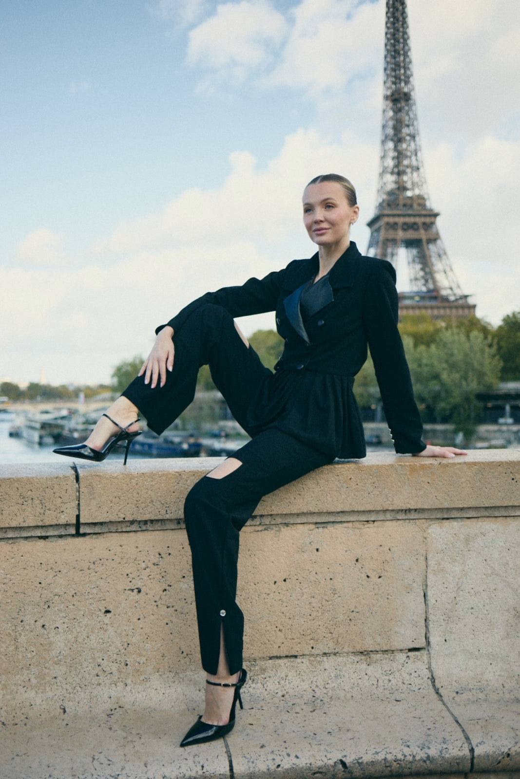 Descripción técnica: Pantalón recto en crêpe satinado negro con ribete en PU. Tiro alto estructurado, abertura en rodilla de 7,5 cm, cierre posterior invisible de 18 cm y botones metálicos personalizados Zcapitta.