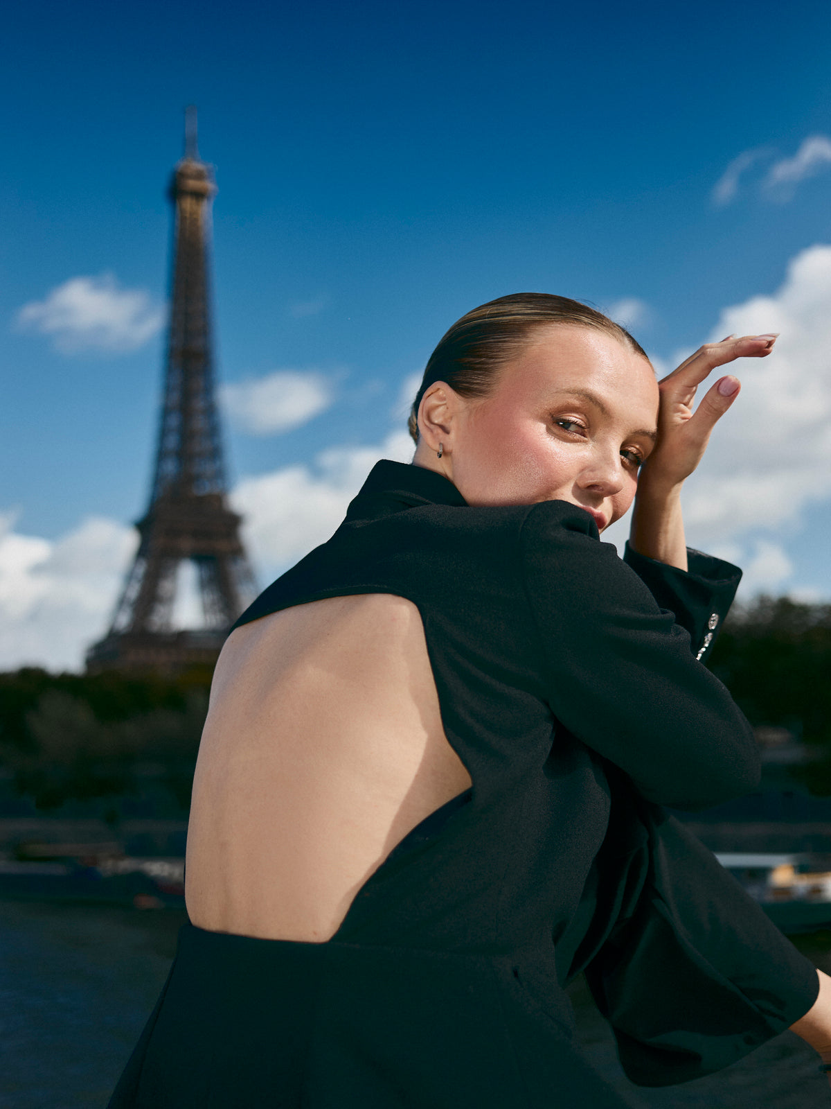 Una armadura elegante que habita el cuerpo. El Exoskeleton Blazer equilibra fuerza y vulnerabilidad a través de una estructura frontal precisa y una apertura posterior que revela la espalda con sutileza. Su sobrefalda plisada aporta movimiento escultural, mientras los ribetes en PU sellan una presencia poderosa y contenida.