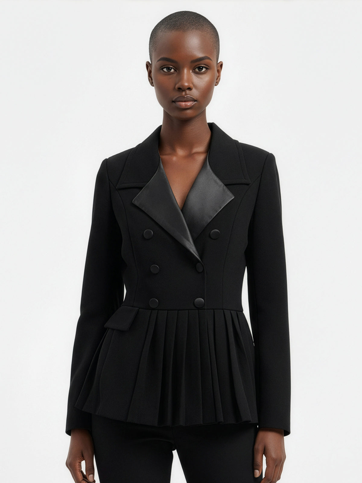 Descripción técnica: Blazer estructurado en crêpe negro con ribetes en PU y forro en acetato estampado Zcapitta. Doble abotonadura frontal, escote posterior estructural con tirantes internos y hombreras anatómicas.