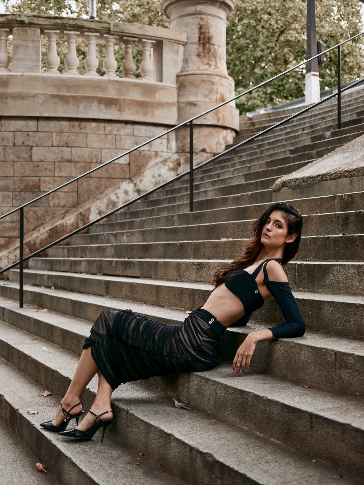 Capas de mesh negro se cruzan sobre una base de crepé elástico, envolviendo el cuerpo con un drapeado que revela y contiene a la vez. El forro en lycra nude aporta contraste y profundidad, mientras la silueta fluida hasta el tobillo mantiene una elegancia limpia y sensual.