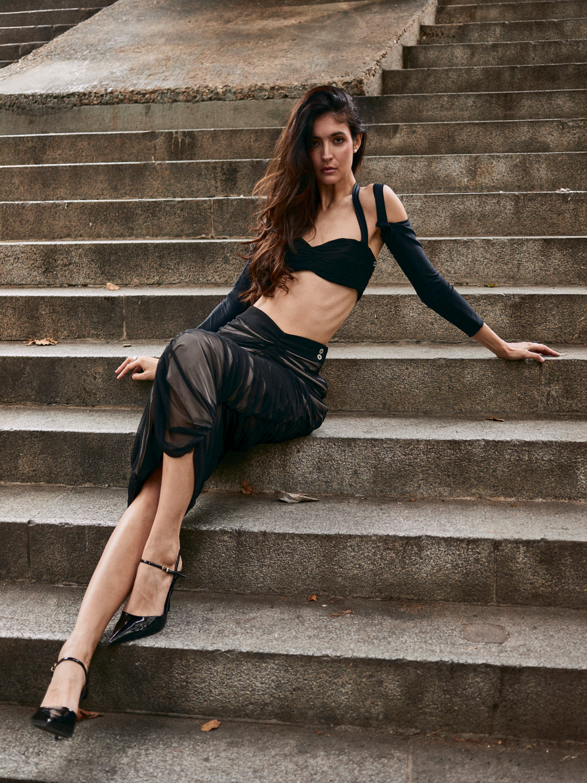 Descripción técnica: Falda larga en mesh negro sobre crepé elástico, forrada en lycra nude. Drapeado frontal y posterior, tiro medio, cierre invisible de 18 cm y botones metálicos Zcapitta en pretina lateral.